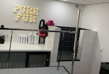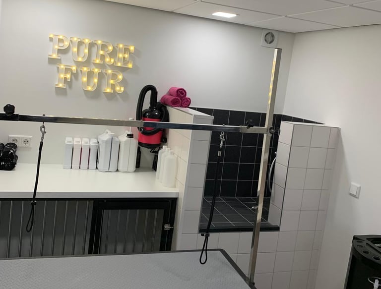 De salon beschikt over een grote elektrische trimtafel, een bad met warm water, kwalitatieve shampoo's en materialen.